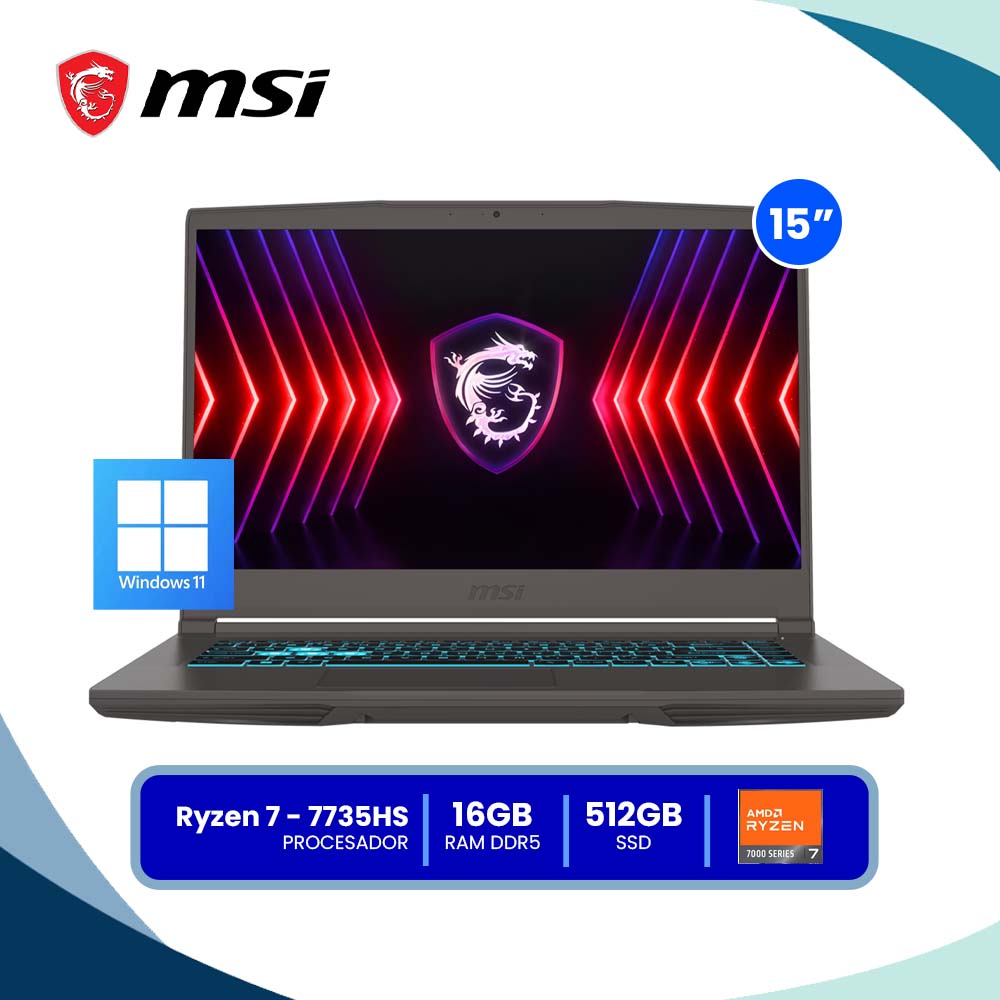 La Laptop MSI Thin A15 B7VE Ryzen 7 7735HS 16GB RAM 512GB SSD RTX 4050 6GB Windows 11 ofrece alto rendimiento y potencia gráfica. Está diseñada para gamers y profesionales. Por ello, permite trabajar y jugar sin límites.